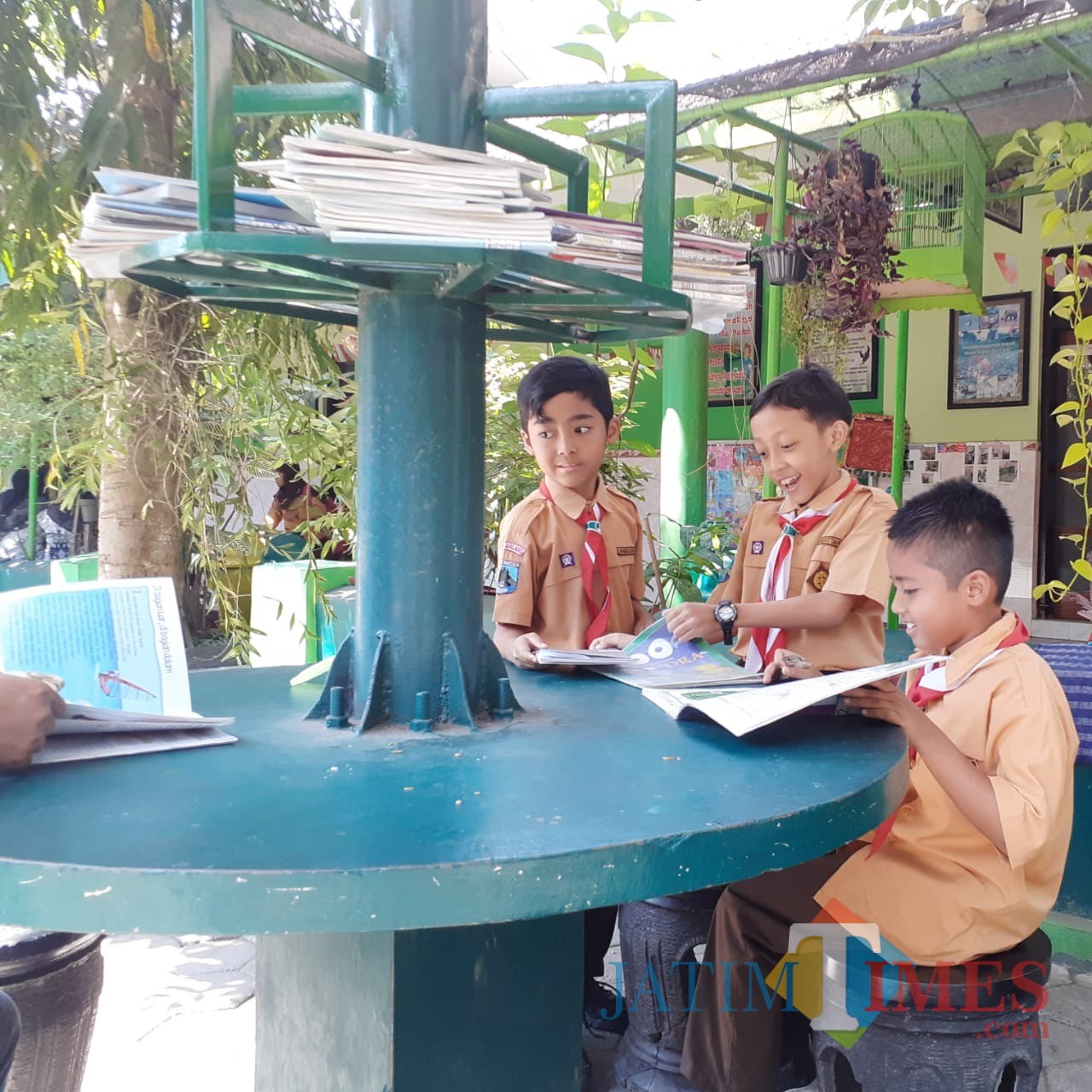 Aktivitas dari para siswa terlihat di area Sudut Literasi. Mereka di jam istirahat tampak duduk mengambil buku bacaan dan menikmati bacaannya di area taman sekolah ini.
