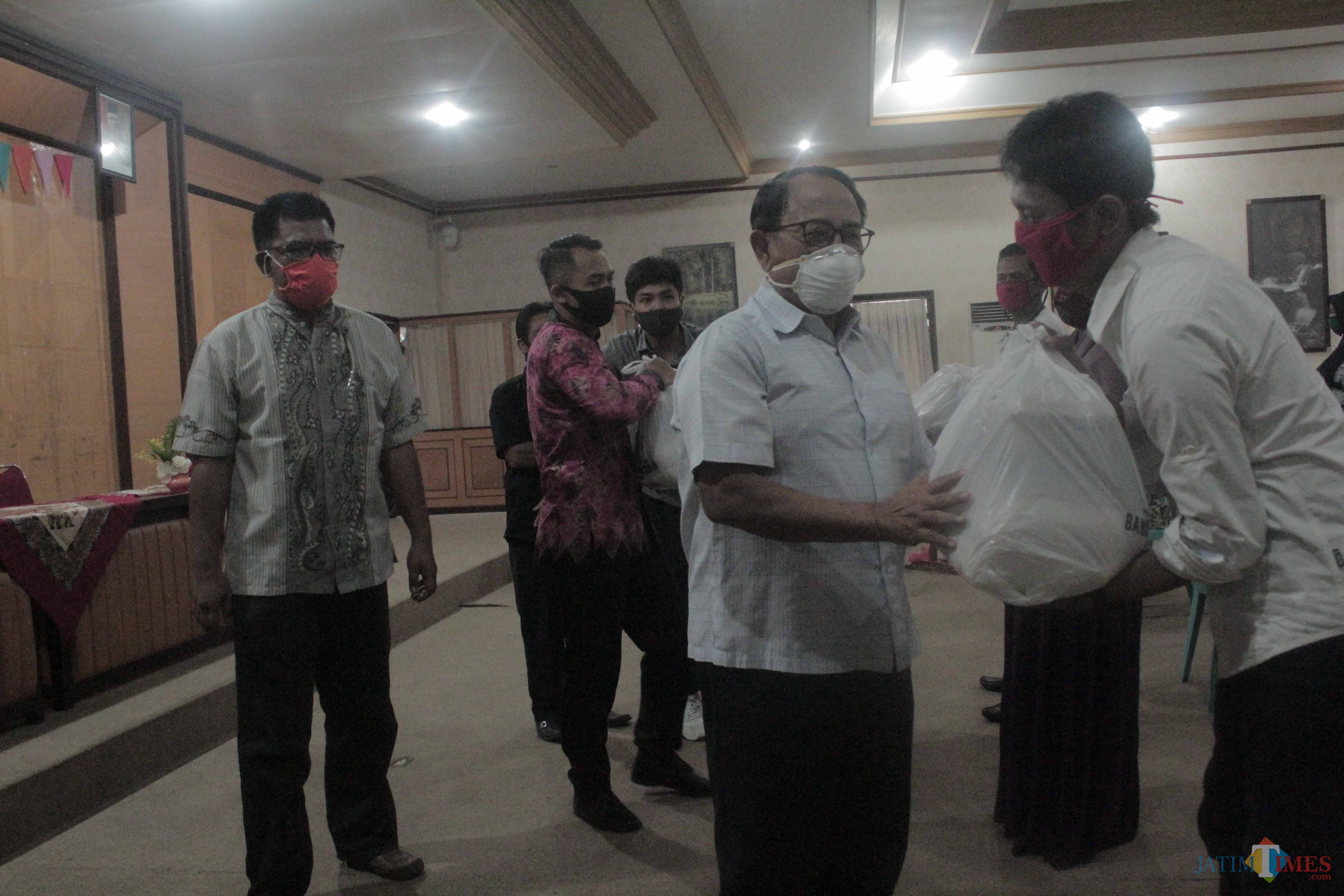 Bantuan sosial kepada pekerja seni diserahkan Bupati Blitar Rijanto didamping Kepala Dinas Parbudpora Suhendro Winarso di Aula Dinas Parbudpora Kabupaten Blitar, Jumat (15/5/2020). Untuk menghindari kerumunan dan mencegah penularan Covid-19, acara simbolik ini hanya dihadiri 18 perwakilan penerima manfaat dari kalangan pekerja seni. Selanjutnya pihak dinas akan mendistribusikan langsung kepada penerima secara door to door.
