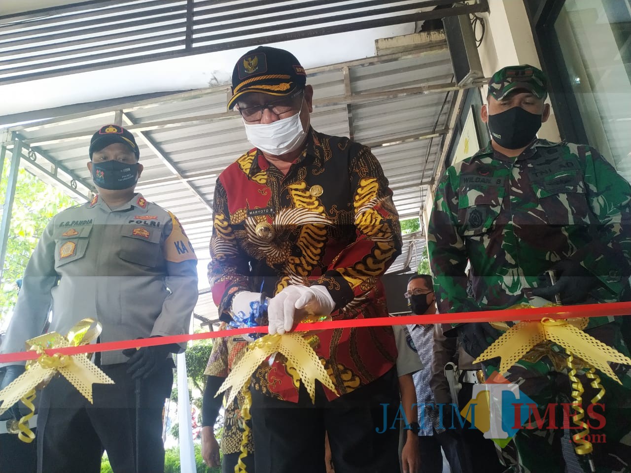 Bupati Tulungagung Maryoto Bhirowo didampingi Kapolres AKBP Eva Guna Pandia dan Dandim 0807 Letkol Inf Wildan Bahtiyar menggunting pita tanda diresmikannya Samsat dan Swalayan Tangguh.