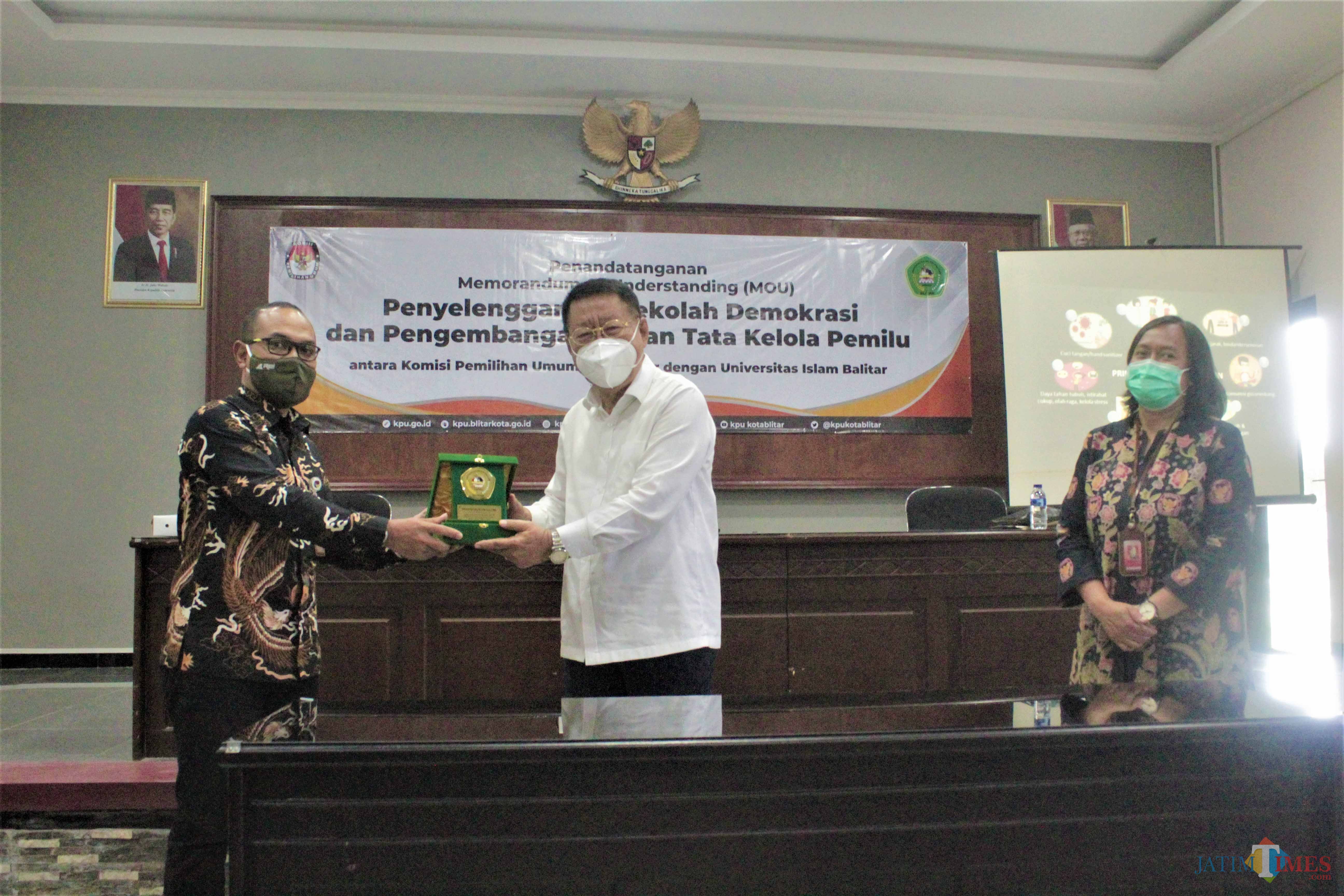 Ketua KPU Kota Blitar Choirul Umam dan Rektor Unisba Blitar Soebiantoro bertukar cindera mata.(Foto : Aunur Rofiq/BlitarTIMES)