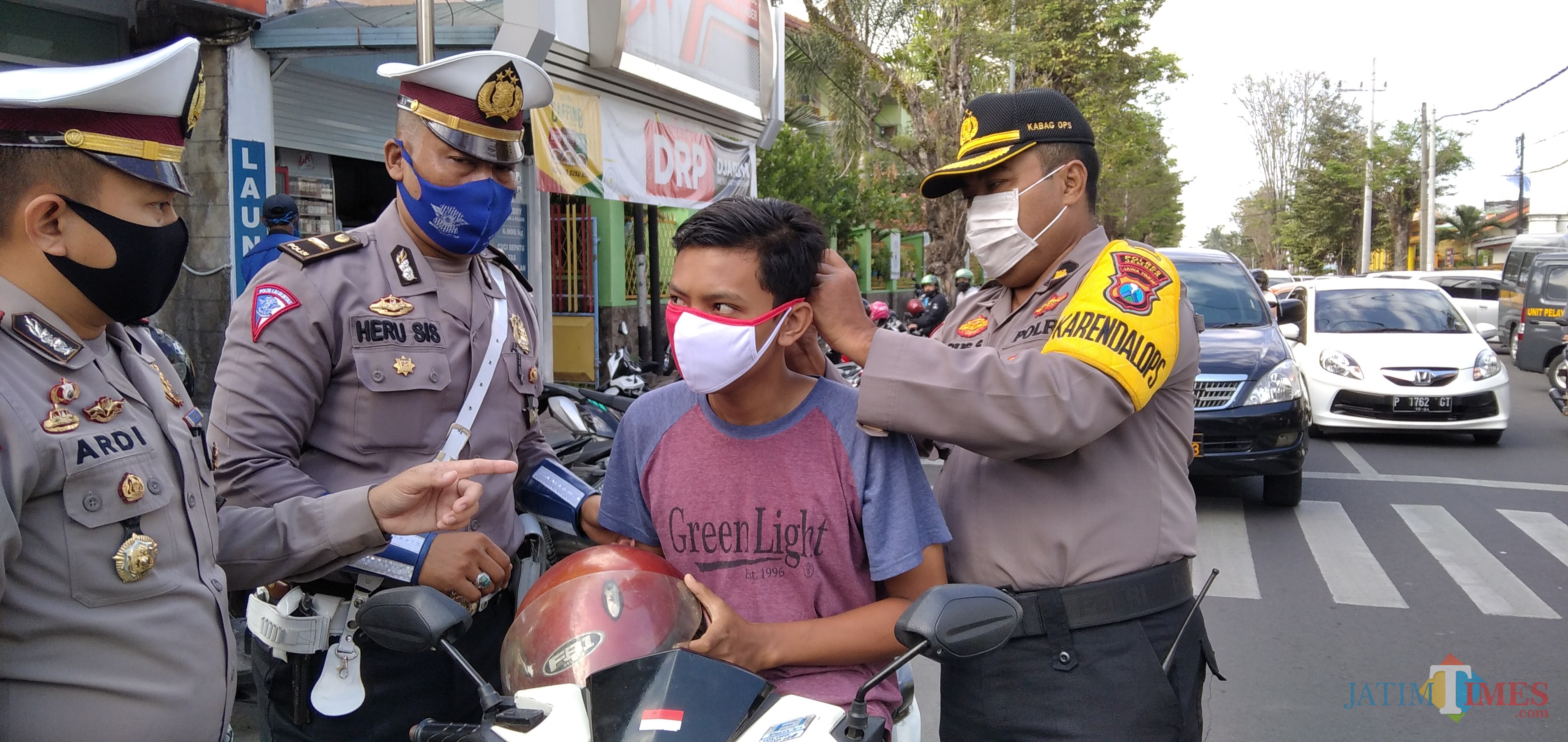 Kabagops Polres Jember Kompol Agus Suparyono bersama dengan Kasatlantas AKP. M. Ardhi Wibowo saat memasang masker kepada pengendars (foto : Moh. Ali Makrus / Jatim TIMES)