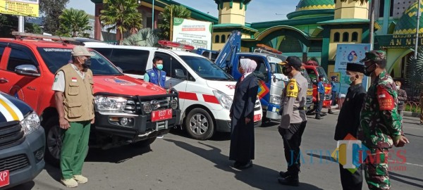 Wali Kota Batu Dewanti Rumpoko bersama Kapolres Batu AKBP Catur Cahyo Wibowo saat mengecek kesiapan apel gelar pasukan Operasi Lilin 2020 di di Alun-Alun Kota Batu, Senin (21/12/2020).