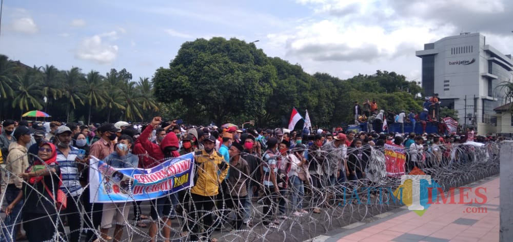 Ribuan massa yang tergabung dalam Aliansi Masyarakat Bela Kiai (Wabup Jember Drs. KH. Muqit Arief, red) Selasa (22/12/2020) menggelar aksi unjuk rasa di halaman kantor Pemkab Jember.