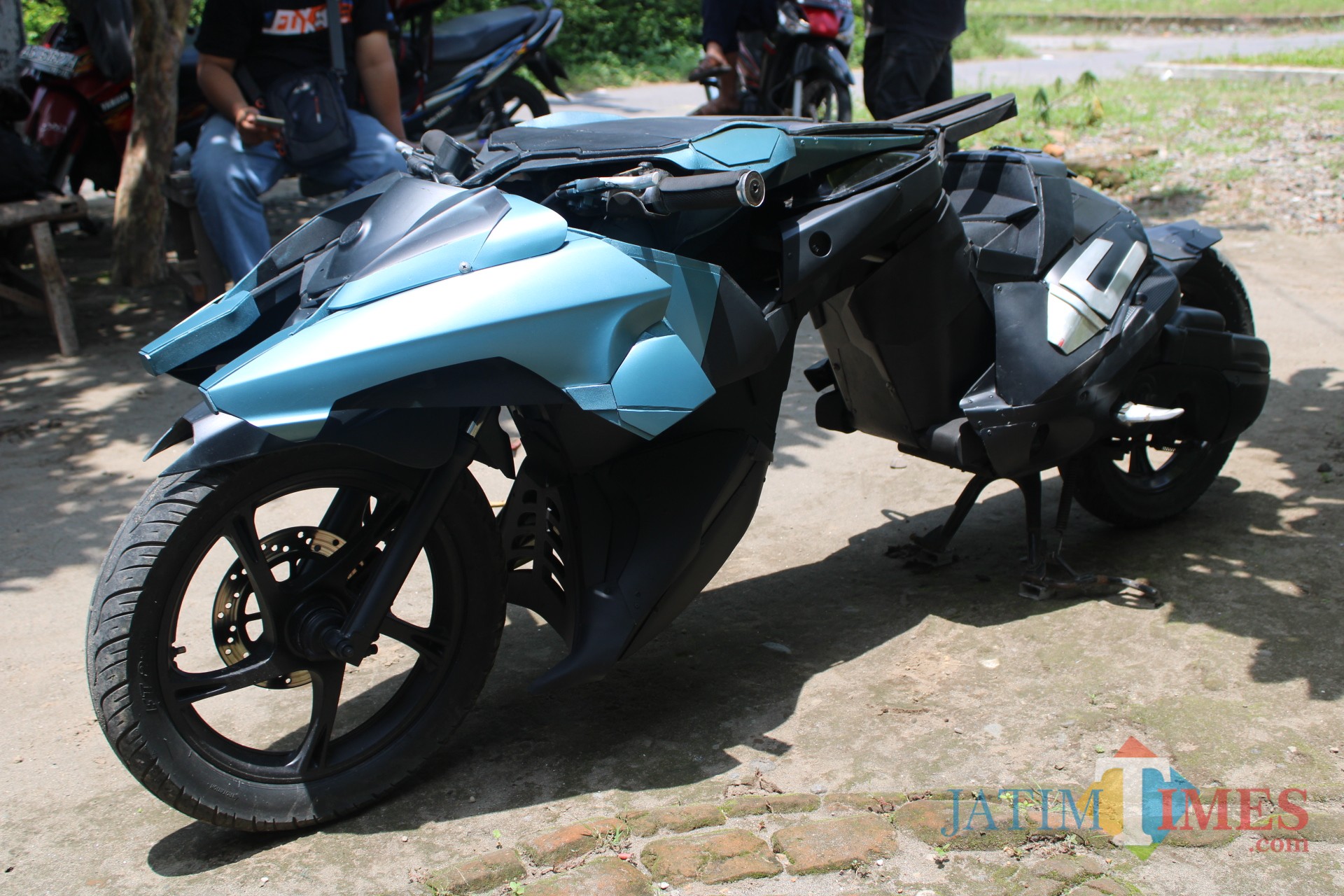 Bentuk yamaha mio 2008 tersebut, dirombak total oleh bapak dua anak ini. Mulai dari rangka kendaraan hingga bodi motor. Yang tersisa hanya bagian mesin kendaraan dan ban motor, serta sock breaker bagian depan.