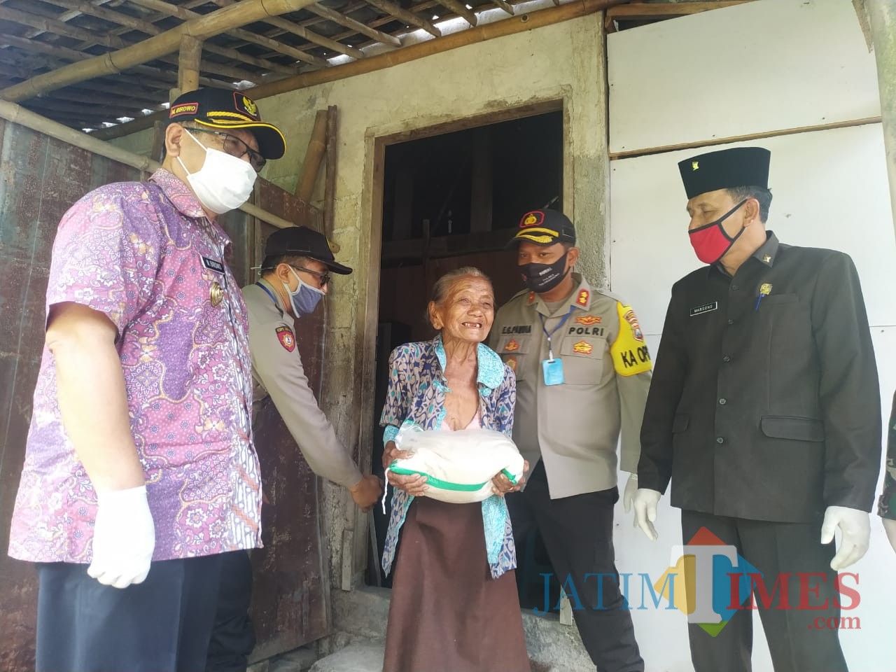 Kapolres Tulungagung, AKBP Eva Guna Pandia bersama Dandim 0807/ Tulungagung Letkol Inf. Wildan Bahtiar dan Bupati Maryoto Birowo memberikan bantuan sembako kepada masyarakat kurang mampu dan tidak tercover dalam bantuan sosial di Kecamatan Kedungwaru, Jumat (15/5/2020) siang.