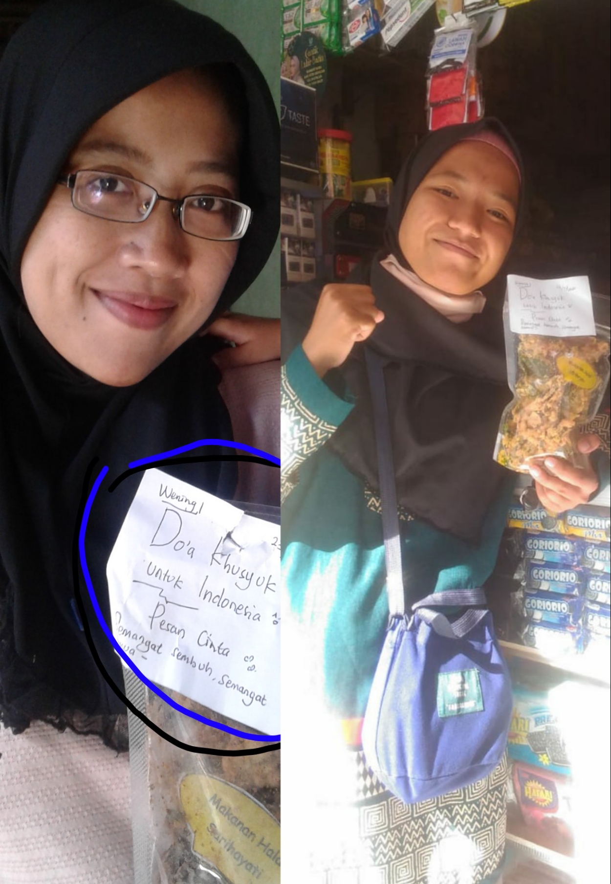 "Do’a khusyuk untuk Indonesia, pesan cinta semangat sembuh, semangat Indonesia,” tulisnya di luar kemasan keripik tempe yang dijualnya Rp15.000 per bungkus.