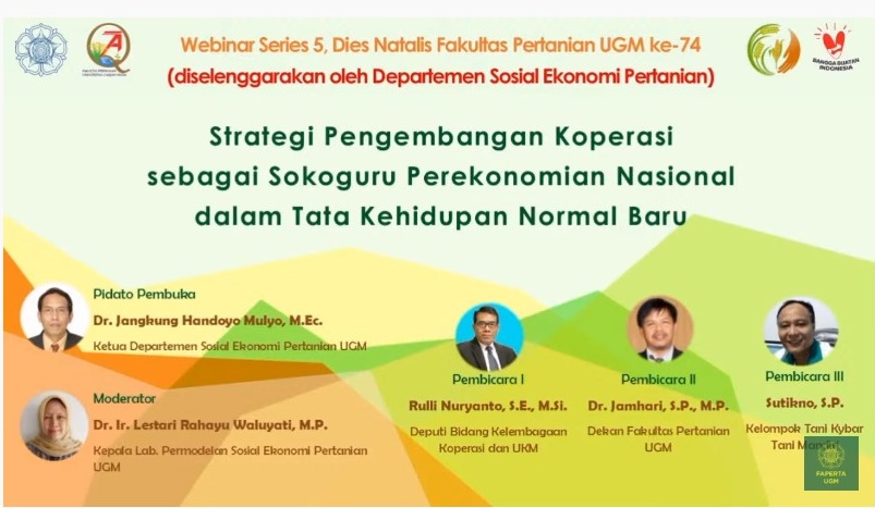 Hadir dalam acara tersebut 3 (tiga) narasumber yaitu Rulli Nuryanto,S.E.,M.Si.(Deputi Bidang Kelembagaan Koperasi dan UKM), Dr. Jamhari, S.P.,M.P.(Dekan Fakultas Pertanian UGM), dan Sutikno, S.P. (Ketua Koperasi Kybar Tani Mandiri). Masing-masing narasumber mewakili perannya sebagai pemegang kebijakan, akademisi, dan pelaku penggiat koperasi pertanian Indonesia. Total peserta yang bergabung selama acara berlangsung baik melalui platform Zoom dan YouTube Live mencapai 360 orang dari berbagai profesi dan asal daerah.