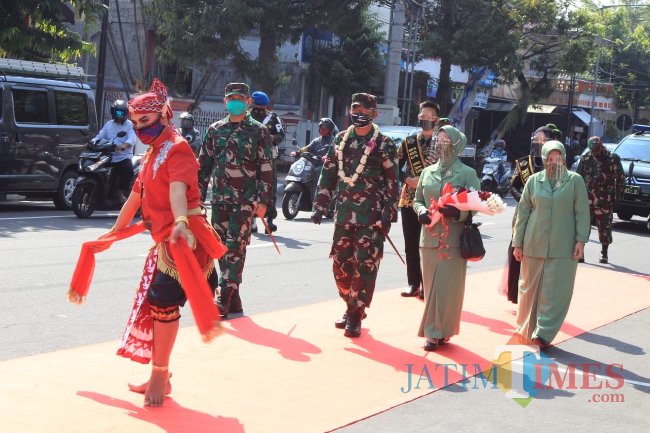 Prosesi penyambutan ditandai pengalungan bunga kepada Danrem 081/DSJ Madiun dan pemberian bucket bunga kepada Ketua Persit KCK Koorcab Rem 081/DSJ Dewi Waris Ari Nugroho. Acara kemudian dilanjutkan paparan Dandim 0808/Blitar mengenai kondisi wilayah tanggungjawabnya dan kondisi satuan yang dipimpinnya di hadapan Danrem 081/DSJ Madiun.