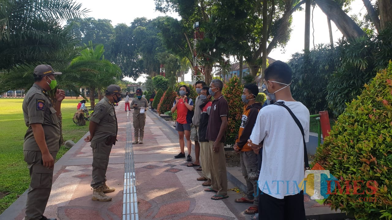Kali ini sejumlah masyarakat bandel dalam menjalankan protokol kesehatan mendapatkan hukuman dari petugas gabungan yang tengah melakukan patroli, Sabtu (18/7/2020). Sebagian ada yang diminta menyapu di Alun-Alun, sebagian lagi diminta membaca Pancasila di Taman Pecut bahkan ada yang disita KTPnya oleh petugas Satpol PP Kota Blitar.