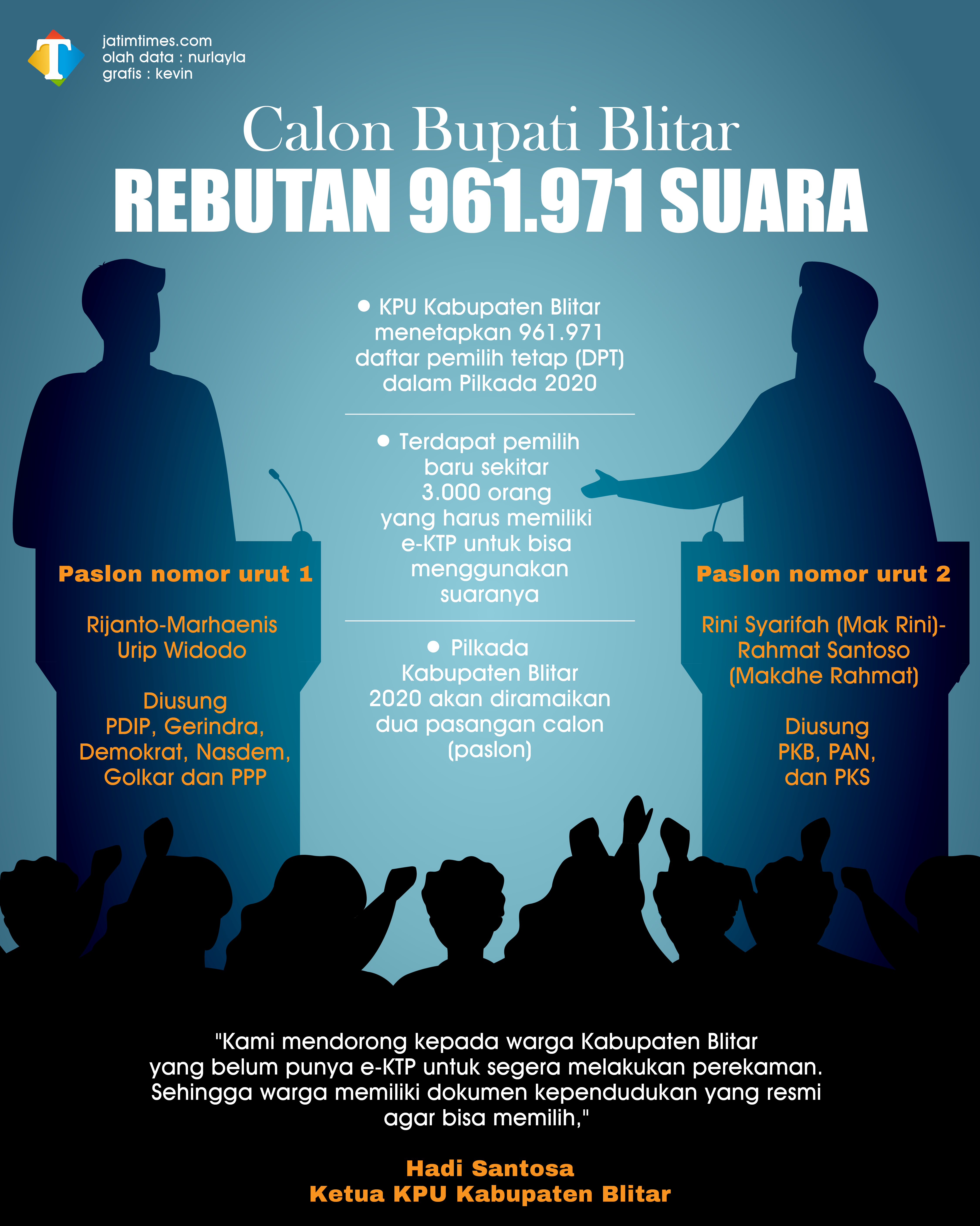 Pilkada Kabupaten Blitar 2020 akan diramaikan dua pasangan calon (Paslon). Paslon nomor urut 1 Rijanto-Marhaenis Urip Widodo diusung PDIP, Gerindra, Demokrat, Nasdem, Golkar dan PPP. Sementara paslon nomor urut 2 Rini Syarifah (Mak Rini) – Rahmat Santoso (Makdhe Rahmat) diusung PKB, PAN, dan PKS.(*)