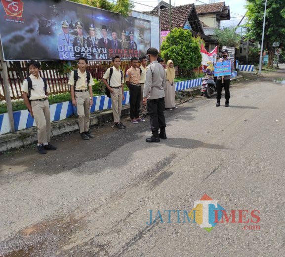 Para siswa SMP saat kedapatan tidak menggunakan masker saat razia yang dilakukan anggota Polsek Gemarang.