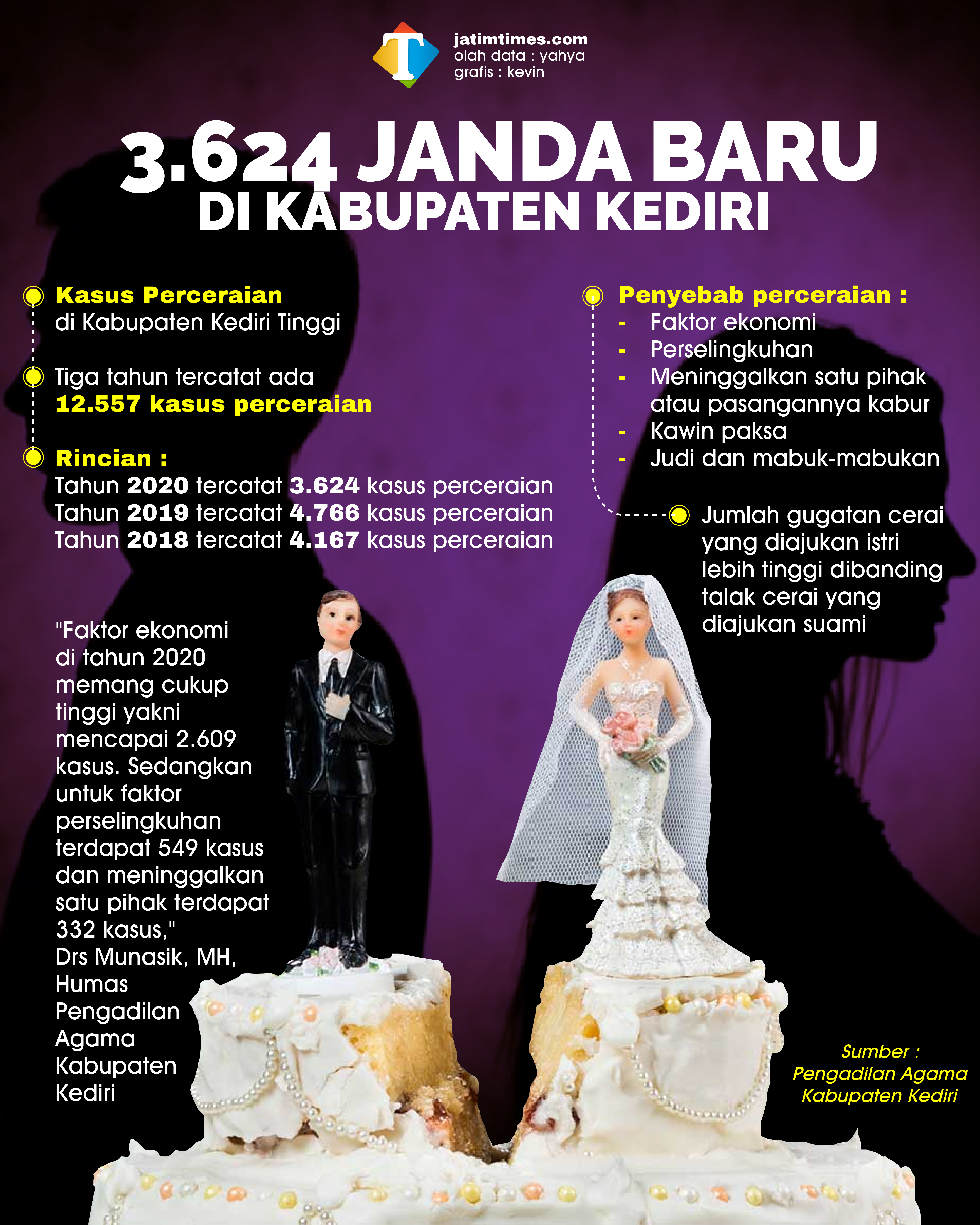 Drs Munasik, MH, Humas Pengadilan Agama Kabupaten Kediri menjelaskan, banyak faktor yang memicu pasangan suami-istri mengalami perceraian. Di mana faktor dominan yang paling tinggi penyebab perceraian itu terjadi yakni dipengaruhi oleh faktor ekonomi. Kemudian disusul oleh faktor perselingkuhan, meninggalkan satu pihak atau pasangannya kabur, kawin paksa, serta sering judi dan mabuk-mabukan menjadi faktor lainnya penyebab terjadinya perceraian.