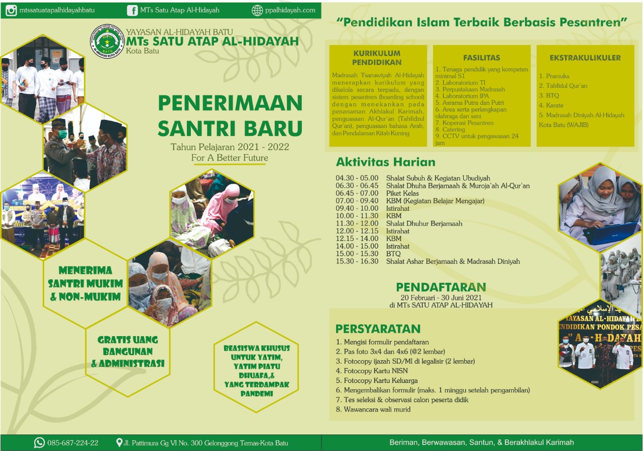 BATUTIMES - Madrasah Tsanawiyah (MTs) Satu Atap Al-Hidayah buka pendaftaran peserta didik baru tahun ajaran 2021-2022. Pendaftaran dibuka pada 20 Februari sampai 30 Juni 2021 bertempat di MTs Satu Atap Al-Hidayah, Pondok Pesantren Al Hidayah, Jalan Pattimura Kelurahan Temas, Kota Batu.