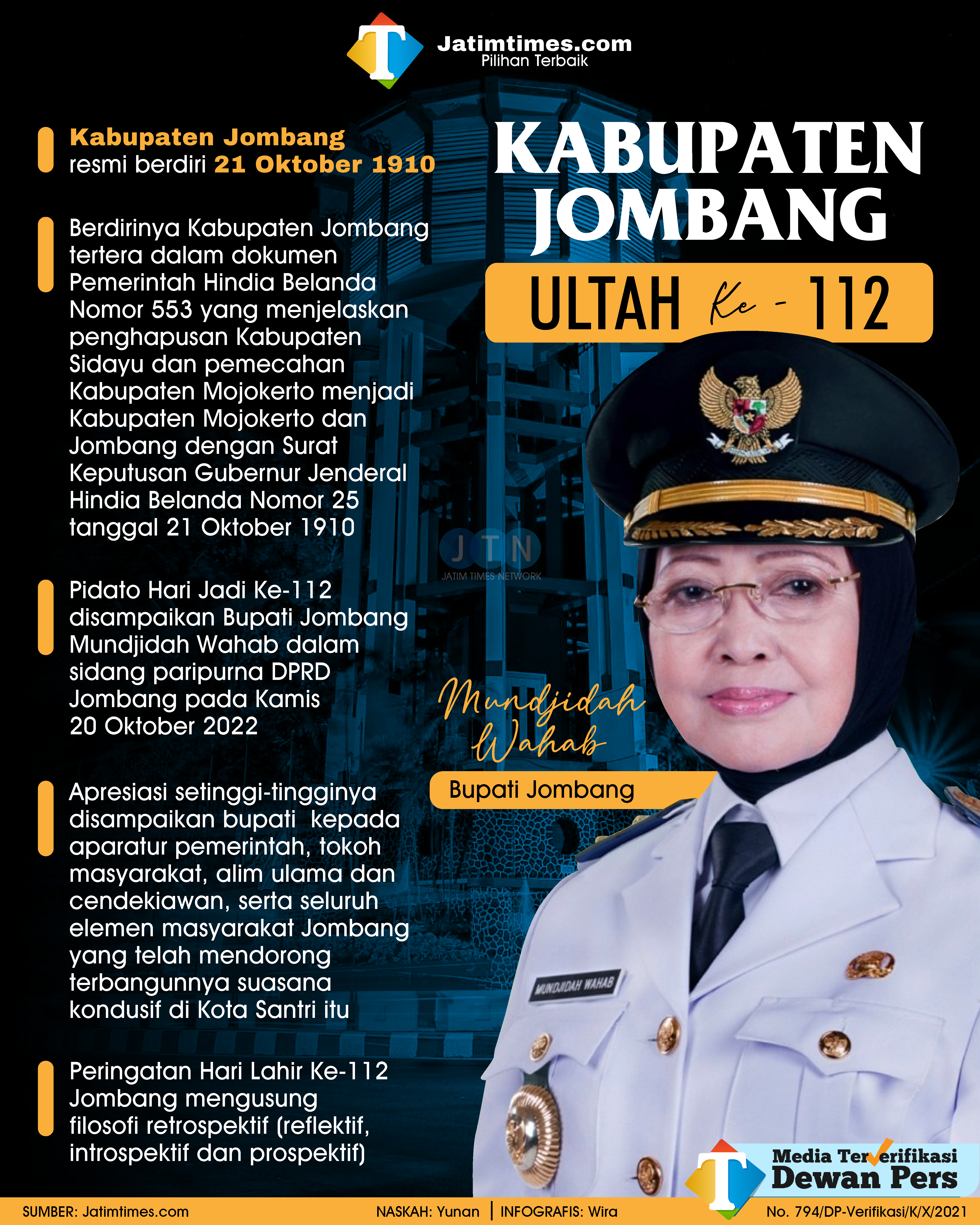 Dijelaskan Mundjidah, penetapan Hari Jadi Jombang telah disepakati bersama jatuh pada setiap tanggal 21 Oktober yang didasarkan atas bukti dokumen yang kuat dan jelas, yaitu dokumen dari Pemerintah Hindia Belanda Nomor 553 yang menjelaskan tentang penghapusan Kabupaten Sidayu dan pemecahan Kabupaten Mojokerto menjadi Kabupaten Mojokerto dan Jombang dengan Surat Keputusan Gubernur Jenderal Hindia Belanda Nomor 25 tanggal 21 Oktober 1910.